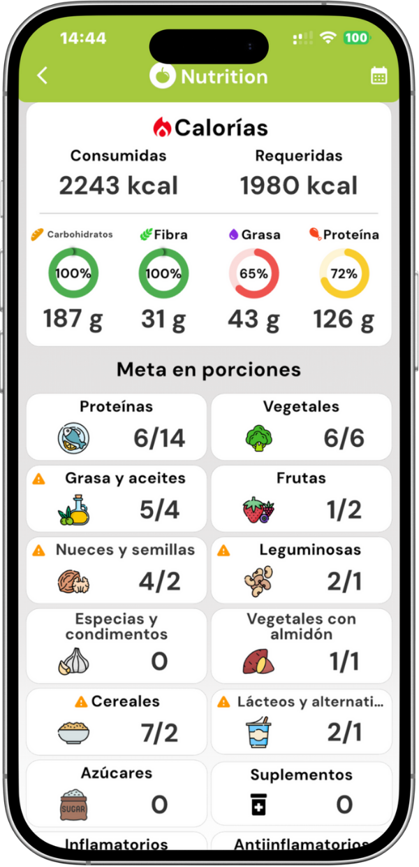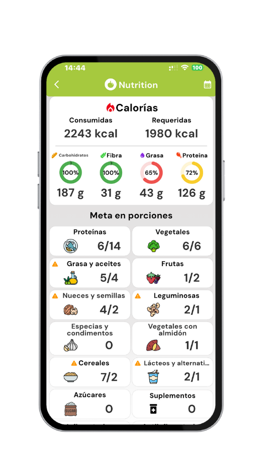 Healthfoodness te ayuda a implementar fácilmente la dieta recomendada y cumplir tu meta en grupos alimenticios en lugar de contar calorías.